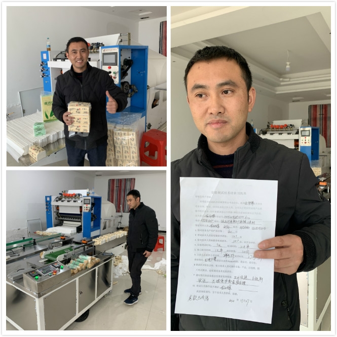 安徽蚌埠五河縣訂購的抽紙機技術(shù)人員已經(jīng)上門安裝調(diào)試完畢,客戶現(xiàn)在已經(jīng)可以獨立操作生產(chǎn)了。